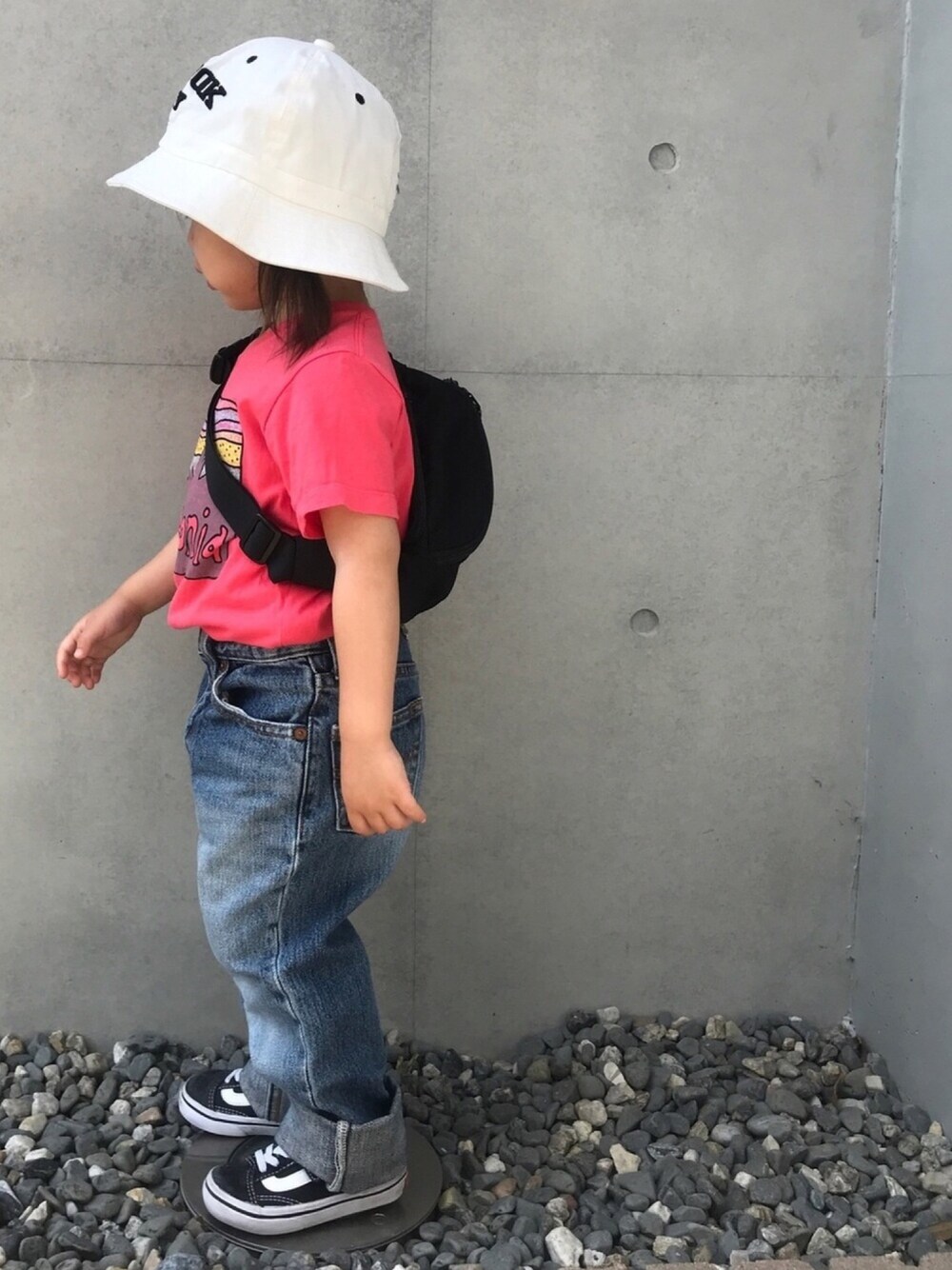 令和ピンク☺︎ ピンクパタTにリーバイス\( ¨̮ )/ 後ろ姿も萌え♡ ハット>>petit main トップス>>Patagonia…4T ボトムス>>Levi’s…100 シューズ>>VANS…15 バッグ>>HusHusH