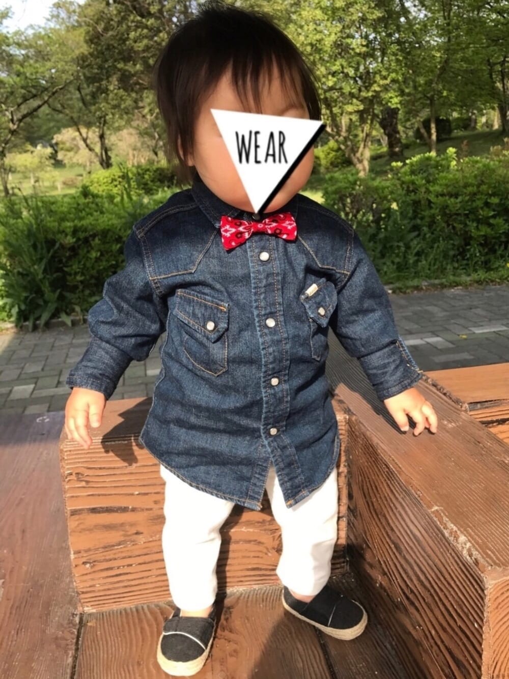 デニムシャツ✕白パン︎☺︎ トップス>>no brand…90 蝶ネクタイ>>Handmade ボトムス>>petit main…90 シューズ>>old navy…11.5