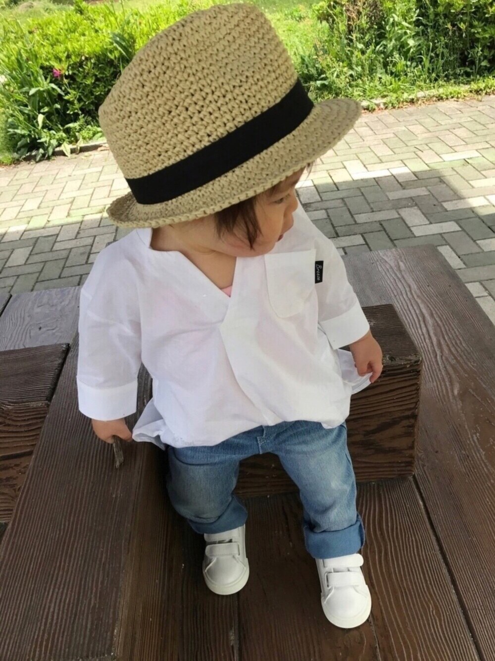 中折れハット✕タックシャツ︎☺︎ 帽子>>petit main…50 トップス>>BREEZE…80 ボトムス>>F.O KIDS…90 シューズ>>H&M…12