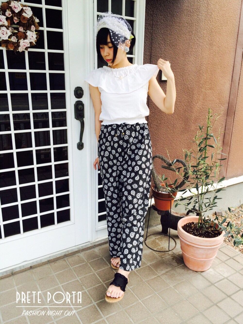 白と黒のコーディネート 向日葵柄のズボンはらくらく なのでよく履いちゃいます