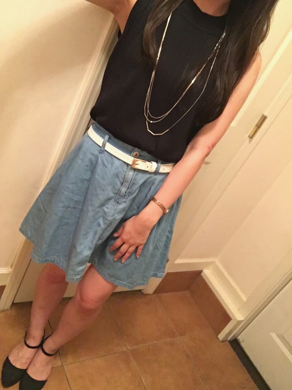 デニムミニスカートは子供っぽくなりがちだけど トップスをノースリーブのリブニット 靴も少しかっちりめにして 少しだけ大人っぽく着てみました👗 ネックレスお気に入り☺️💕