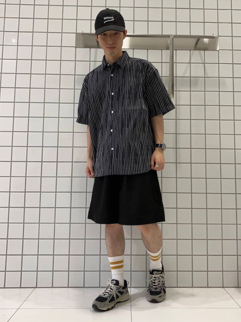 ショーツとシャツで夏らしく涼しげなコーデにまとめました! シャツはただのストライプではなく、ジャガードで少し揺らぎのある模様になっていて、個性を発揮してくれます!