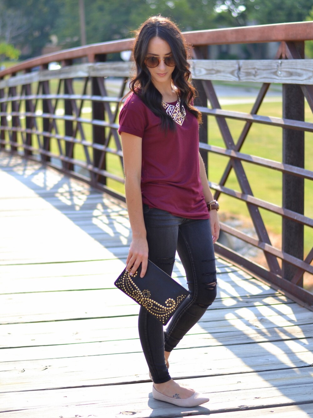 Pair a statement necklace and clutch with a basic tee and distressed jeans for a casual, transitional look!