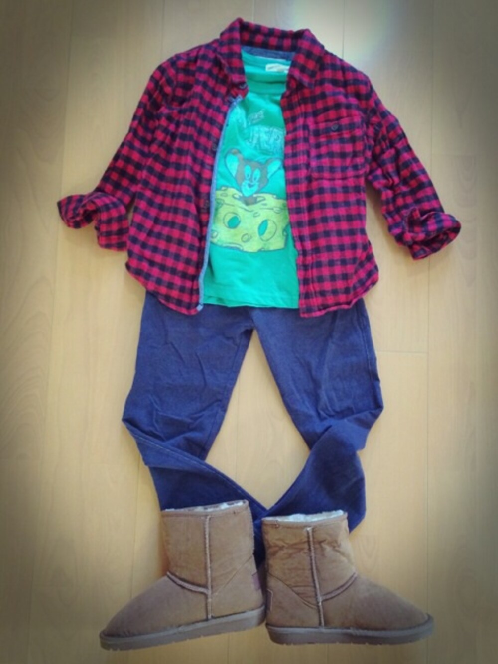 チェックシャツ:GLOBAL WORK ボトム:無印良品 足がでかいのでもう子供サイズない…