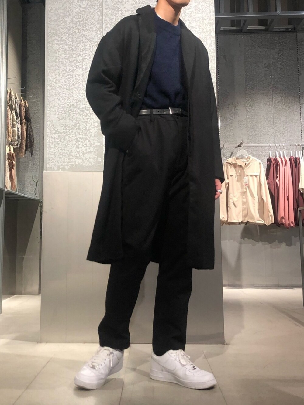 こんにちは! コート、パンツをブラックでまとめトップスだけネイビーにしました 明るい白のスニーカーを履くことでメリハリのついたコーディネートになってます! そろそろ春物が立ち上がってコートが着れなくなるので今のうちにに着ておきます😢