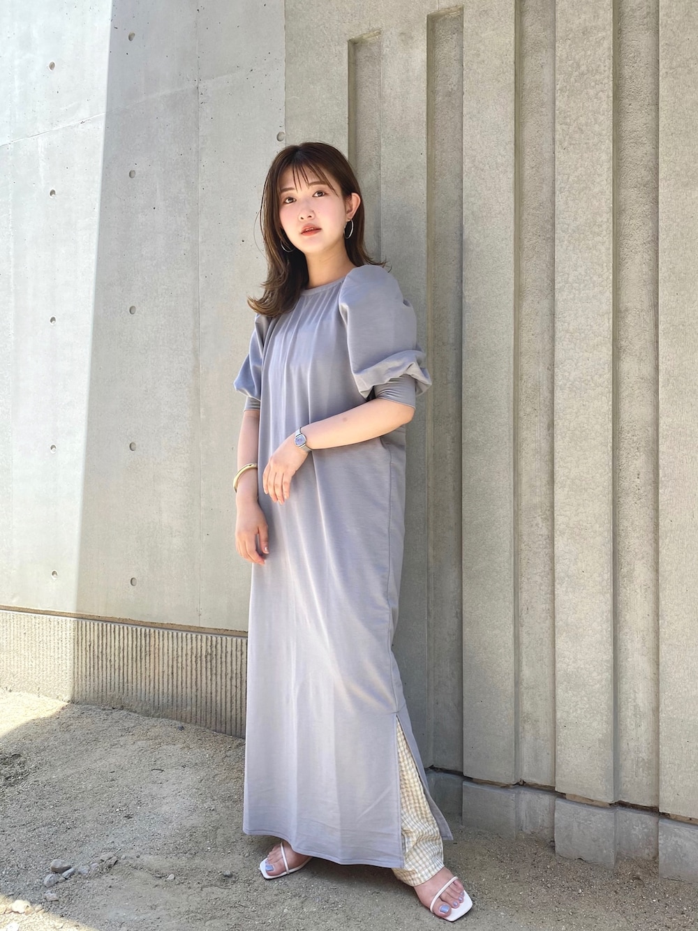Tシャツのようにサラッとした生地のワンピース。 裾のスリットからチェックをチラ見せしてみました。 小柄さんでも簡単にレイヤードスタイルを楽しめます♪