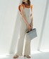 【スタッフレビュー】 柔らかく見えやすいカラーですがインナーをネイビーにした事でメリハリのあるスタイリングに。 コンパクトなトップスと合わせることで小柄な方はスッキリ見えます。 【tops】 着用サイズ:フリー 伸縮性があり着心地の良いシャーリングトップス。 腕周りのシャーリングが華奢見え効果を出してくれます。 【bottom】着用サイズ:1 裾にかけてフレアになっている為美脚が叶うデニムサロペット。 アイボリーだと膨張しやすいですが、ハイウエストのデザインなのでバランスもより綺麗に見えます。 ウエスト周りもゴムで安心なので色んなトップスと合わせて着て頂けます。 【shoes】着用サイズ:37 小柄な方にパンツスタイルには欠かせない厚底サンダル。 柔らかいカラーのお洋服の際はブラックのサンダルを合わせていただく事でメリハリが出ます。