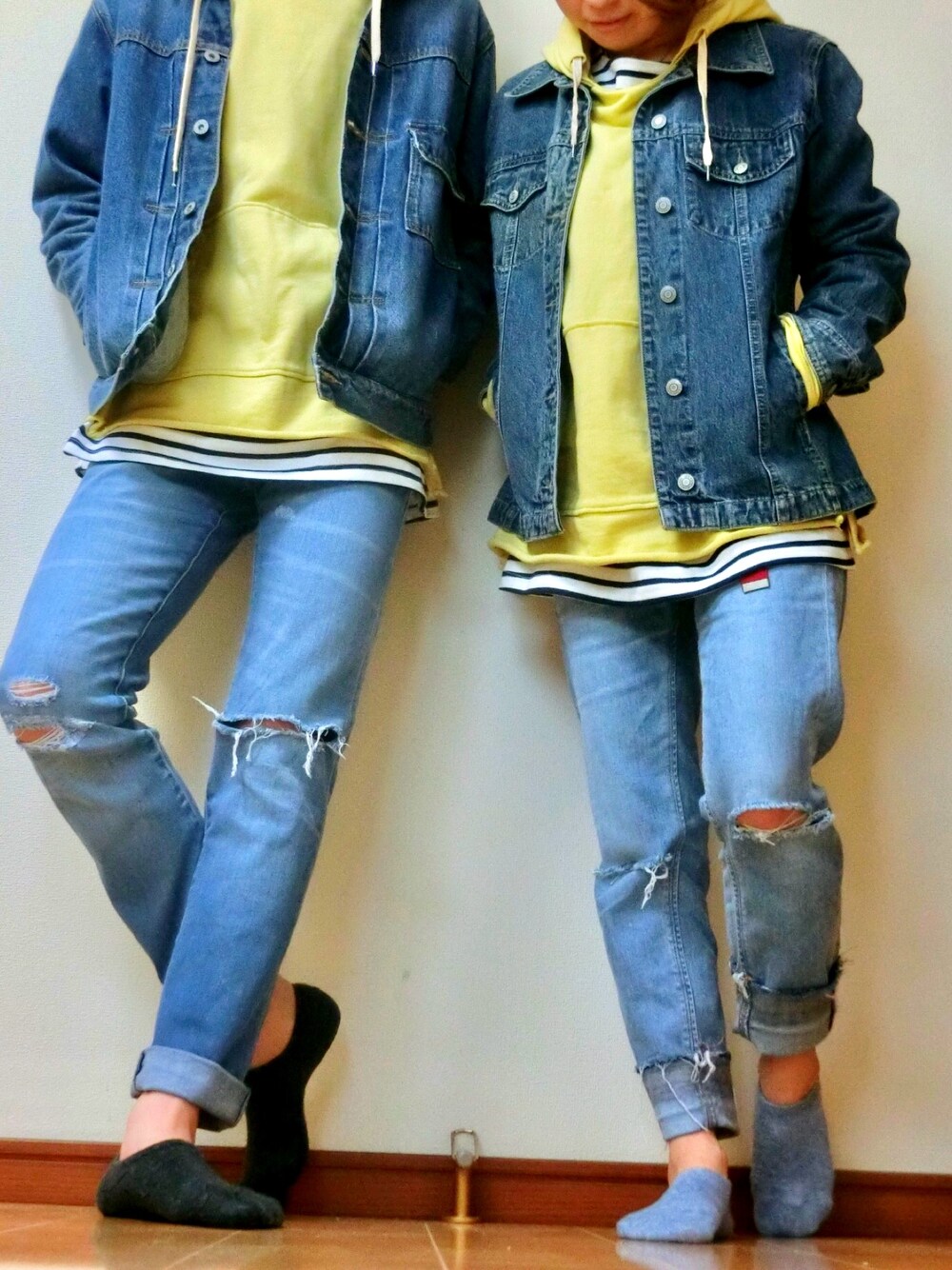 第4段、おそろコーデ! 今回は春らしく黄色パーカーにボーダーちょい見せ、Gジャンに淡色のダメージジーンズで!