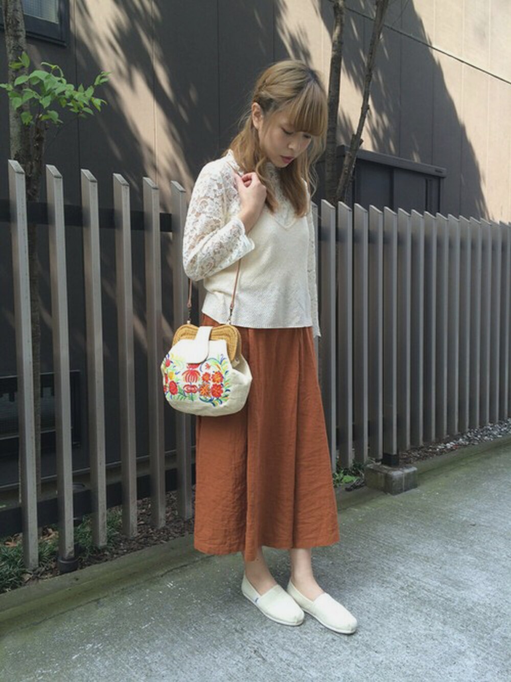 総レースのブラウスもキャミを重ねてきれいめ過ぎず普段使いにも◎ 刺繍入りのLaroneのカゴバック!めちゃめちゃ可愛いです!