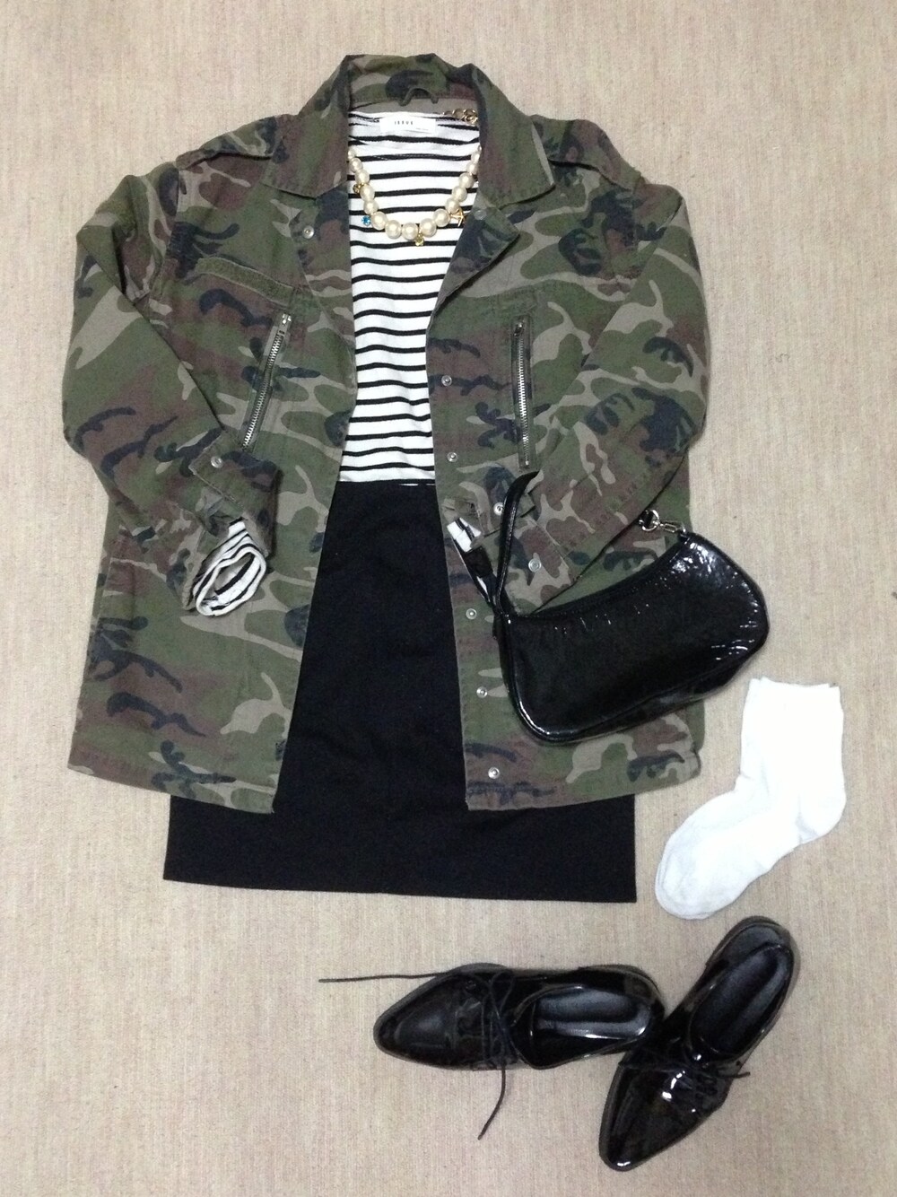 ジャケット:topshop トップス:d-holic スカート:d-holic バッグ:? シューズ:d-holic 子どもの卒業式意識☆ カモフラはダメだよね… でもジャケット脱いだらシンプルだからいいかな〜