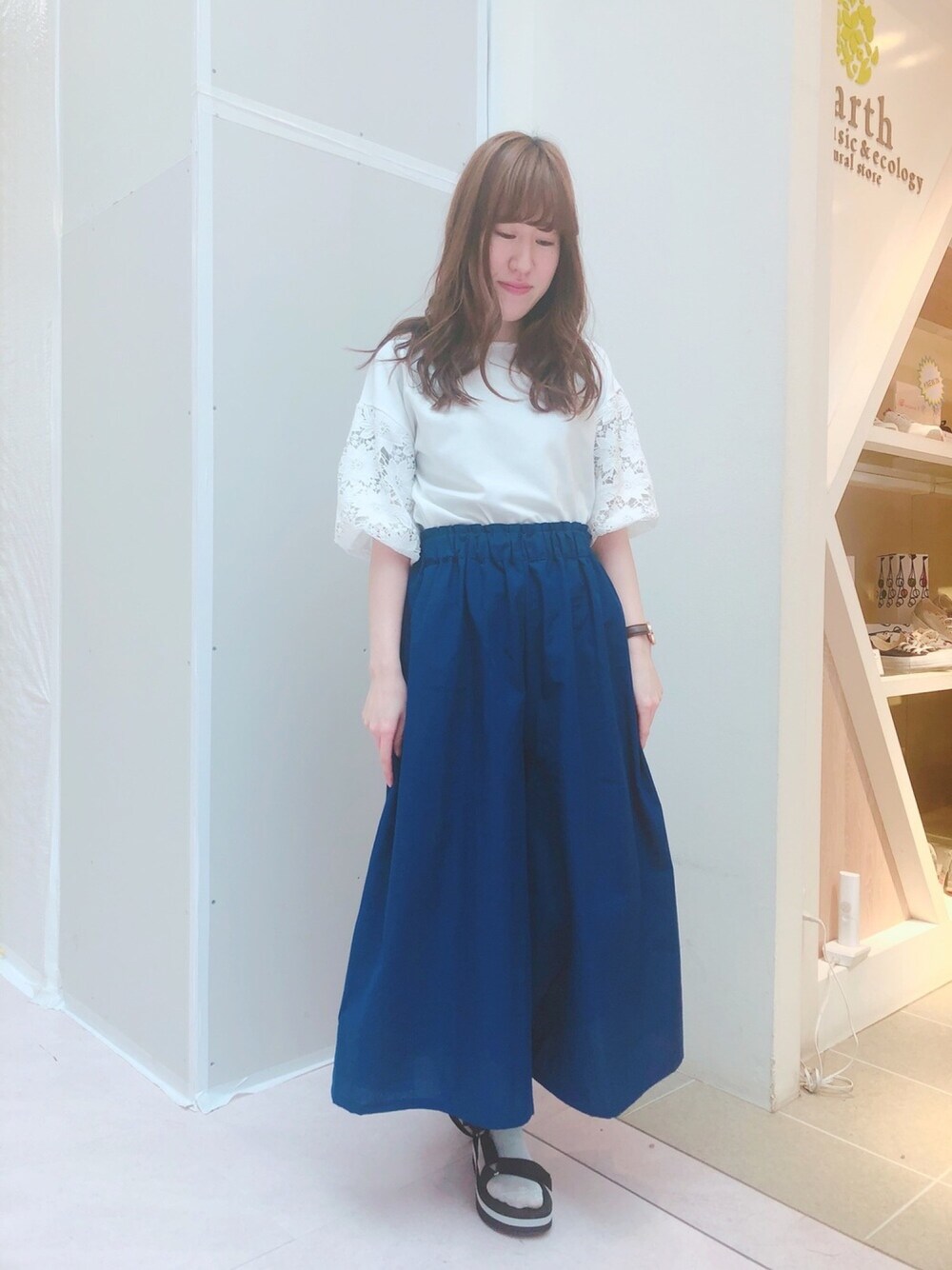 初投稿📝 ポイントは袖レースが可愛いトップスと鮮やかなブルーのボトム!フレンチリネン混スカーチョでリラックス&涼しげな印象に