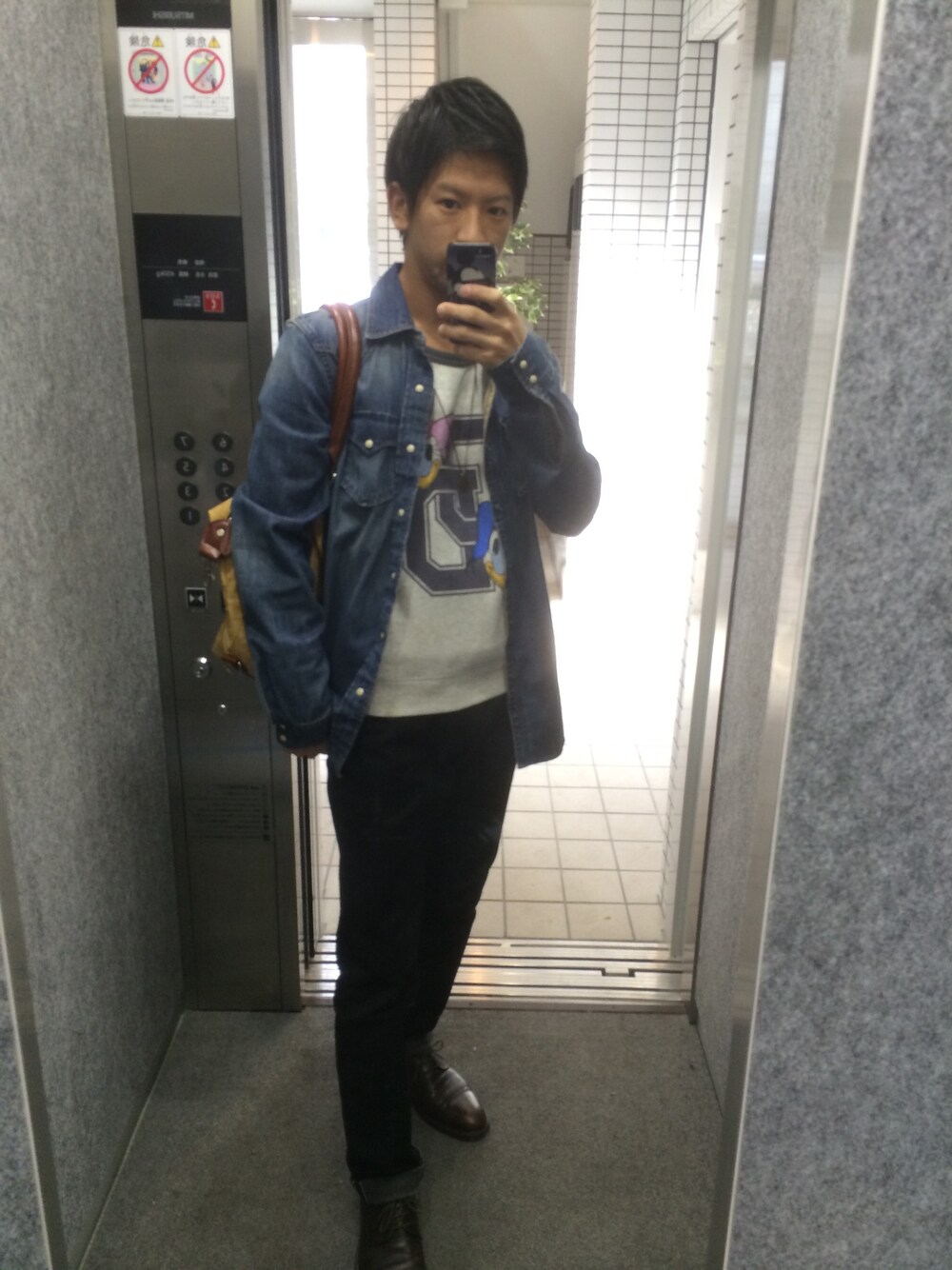 グレー系のTシャツ/カットソーを着用したメンズの秋コーディネートの1枚目の写真