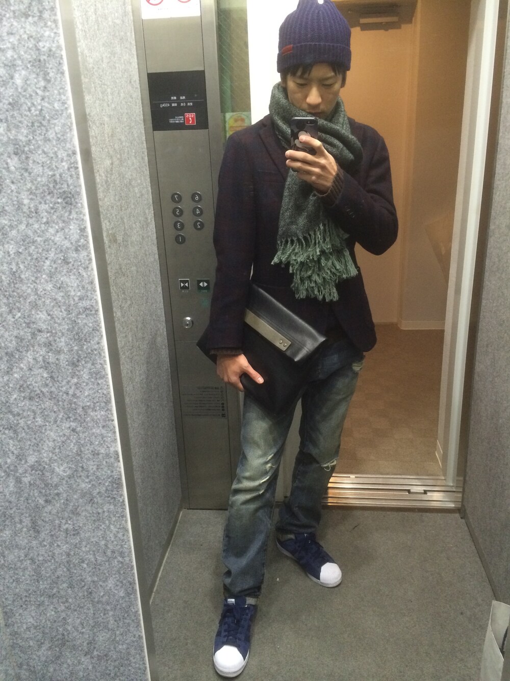 ブルー系のデニムパンツ、ブラック系のクラッチバッグを着用したメンズの冬コーディネートの1枚目の写真