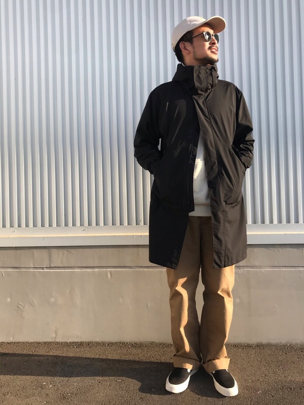 Beige × Black . 2色ぐらいで色をまとめると統一感がよりでますね . ワイドパンツや機能性に優れたフーデットコートを取り入れて旬の雰囲気に