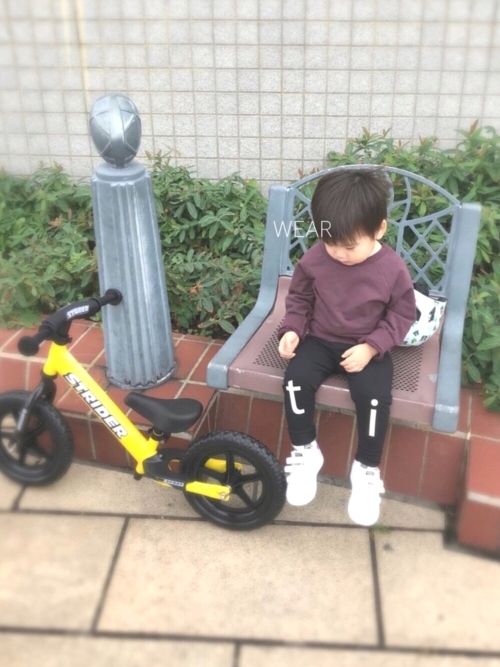 ストライダーデビューの日コーデ🚲♡ トコトコ楽しそうに乗ってました💛 #あずきいろまつり2018 参加させてください💗 お気に入りGrayLabelのすべすべ裏起毛スウェット♡ 2歳0ヶ月 86cm/11.5kg tops → 2-3Y leggins → 4Y