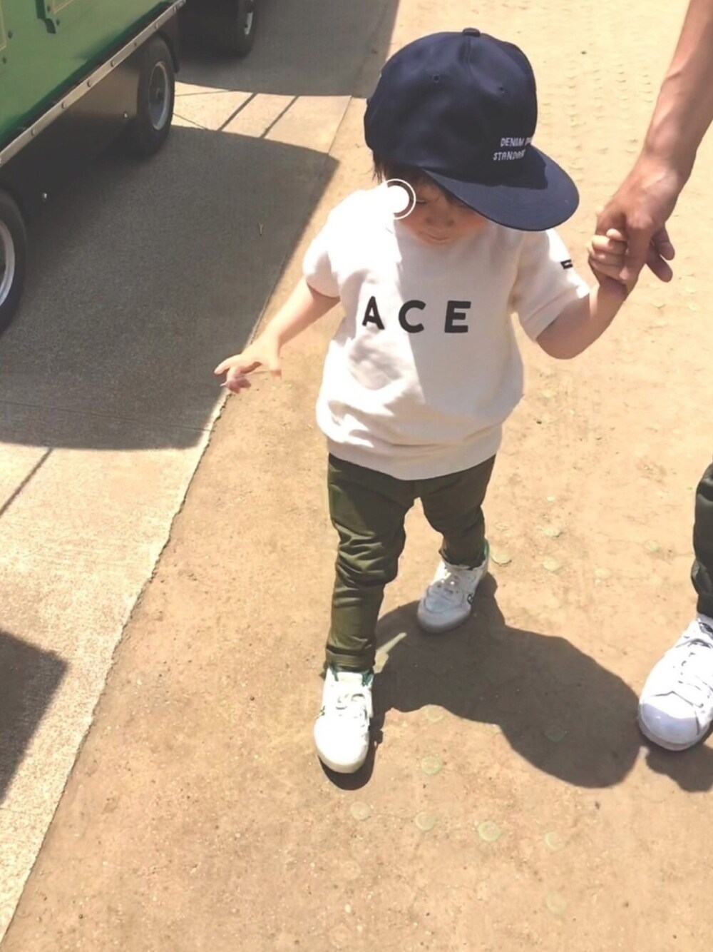 シンプルロゴが可愛い半袖スウェットT♡ パンツはサイズアップでリピート♡ tops → 110cm bottoms → 90cm cap → S 90cm/12kg