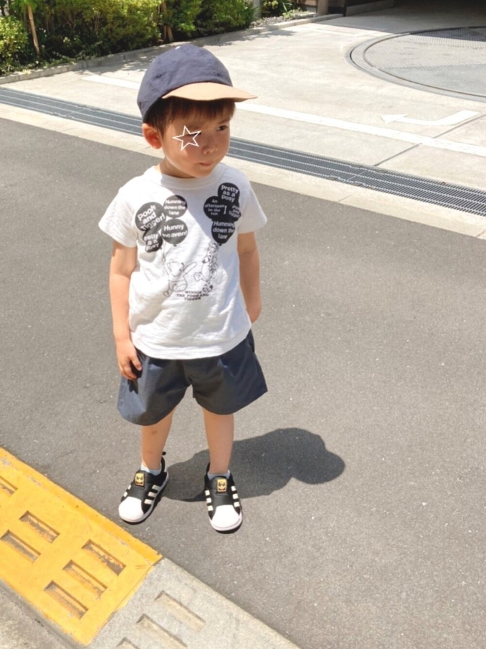 去年のプーさんTEE、今年もお気に入り🧸 パンツはさらさらシャカシャカ素材で夏にぴったり◎ FITHのパンツはやっぱり大きめ🤔 ✴︎3y9m 99.2cm / 13.5kg tops → 100cm bottoms → 100cm