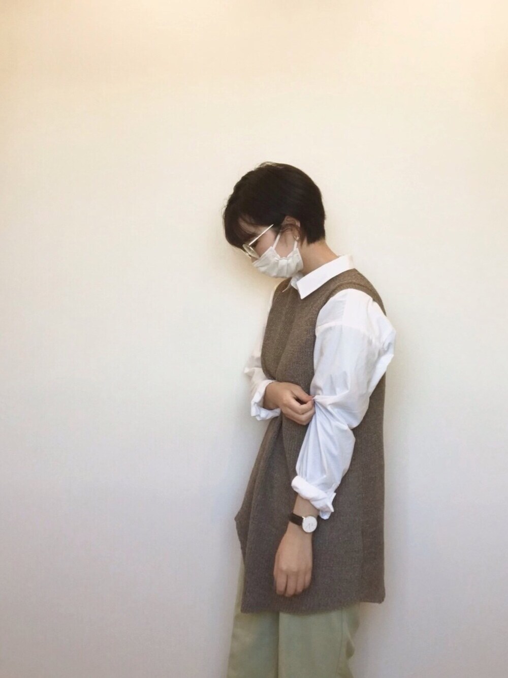 とある日のオフィスコーデ (会社の壁が映える) ずっとPC使ってるから zoffのブルーライトカットメガネが 大活躍🥺🙏 ゴールドフレームで可愛いのだ