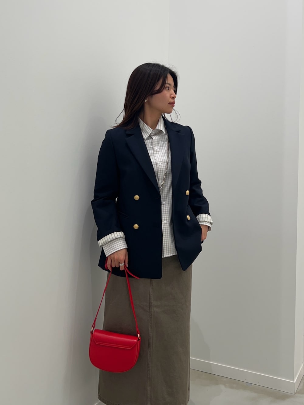 fredyの定番人気 春のダブルブレストジャケットを着てみました🌸 金ボタンや袖裏のストライプがアクセントになり お仕事以外にも着まわせます🏢♡ GEVACOのチェックシャツに デニムスカートを合わせたトラッドな雰囲気の スタイリング꙳⟡ 差し色があるとまとまった印象に🎵 Instagram : @ssor_a12 ‥‥‥‥‥‥‥‥‥‥‥‥‥‥‥‥ 詳細は下からご覧ください↓↓