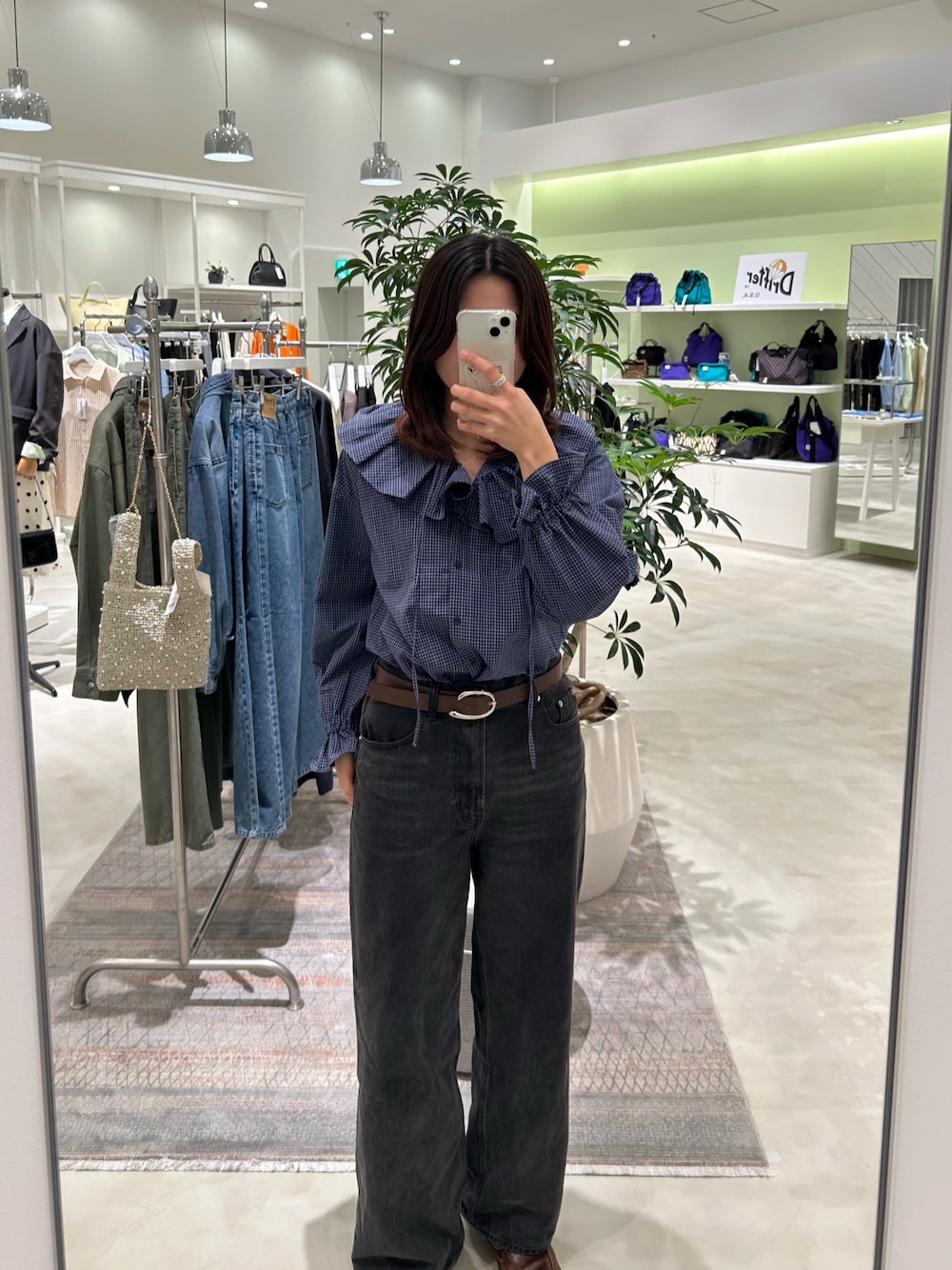 ボリュームのあるフリルカラーが 華やかなアイテム꙳⟡ ブルーチェックもお洒落な雰囲気に✨ ストレートデニムにインしてすっきりとした スタイリングにしました! Instagram : @ssor_a12 ‥‥‥‥‥‥‥‥‥‥‥‥‥‥‥‥ 詳細は下からご覧ください↓↓