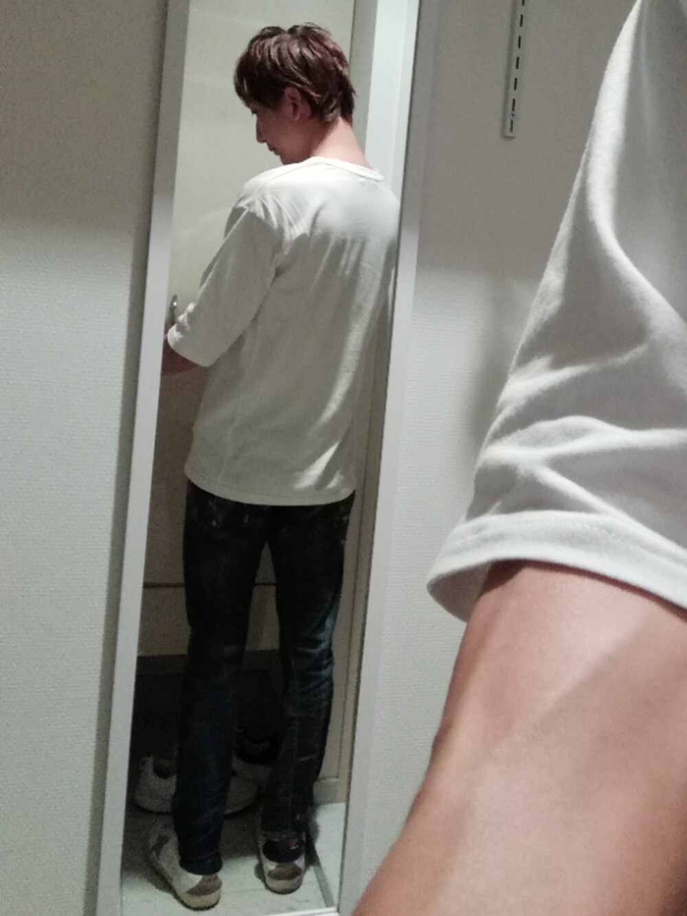 自分で後ろ姿撮って見たくて鏡越しに撮ってみた。 なかなか後ろ姿なんて自分で見る機会ないからなんか新鮮。 けど… 服全然わからんね… でもま、いっか。 記念。。