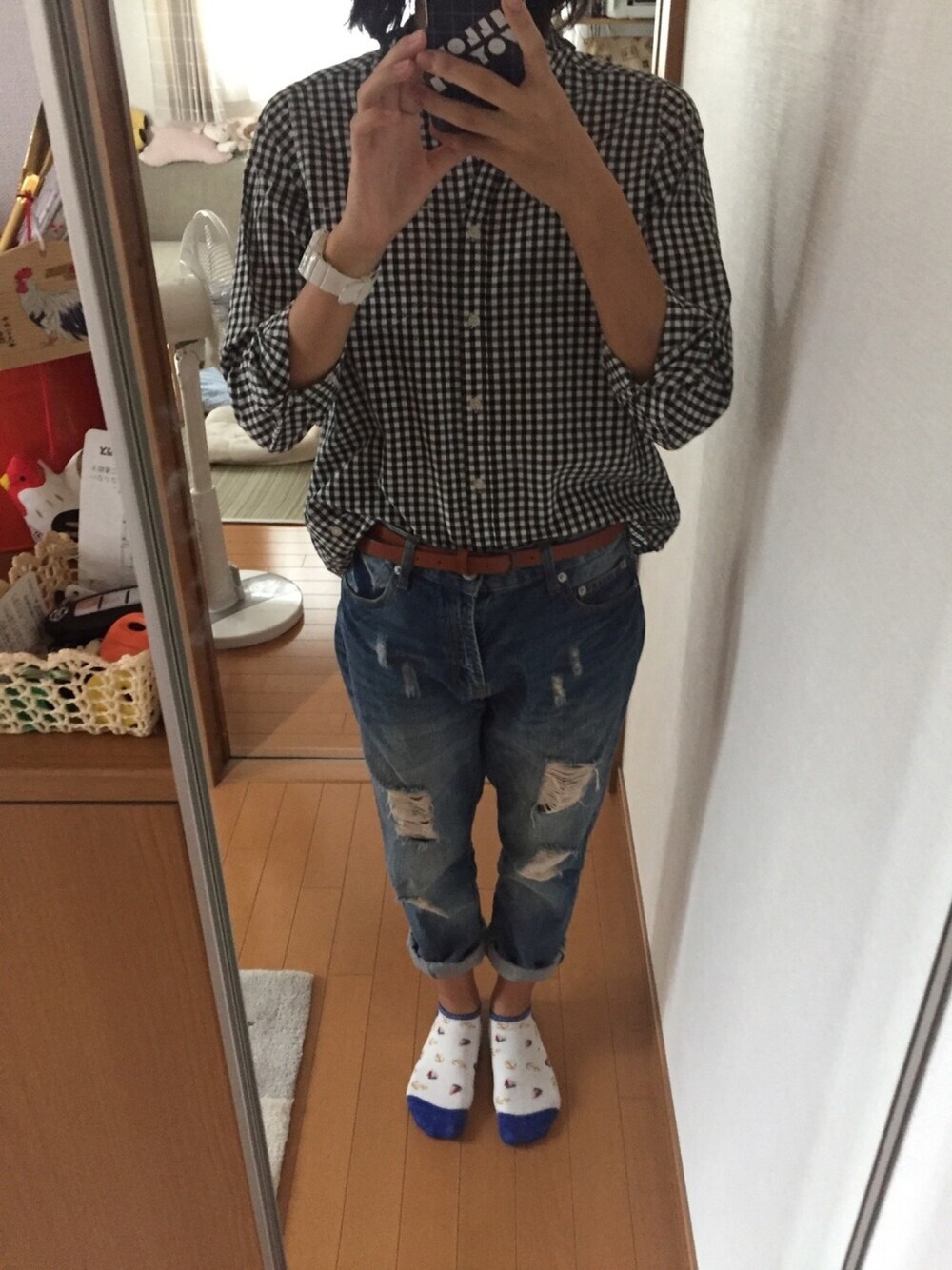 大学スタイル✨ デニムにギンガムチェックのシャツはあいますね😌 前だけインしてベルト、後ろは出してます👌 時計とスニーカーの色もあわせました シャツ1000,パンツ1000,靴2000 円 安い!!!