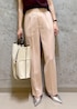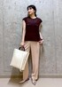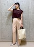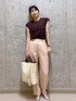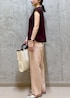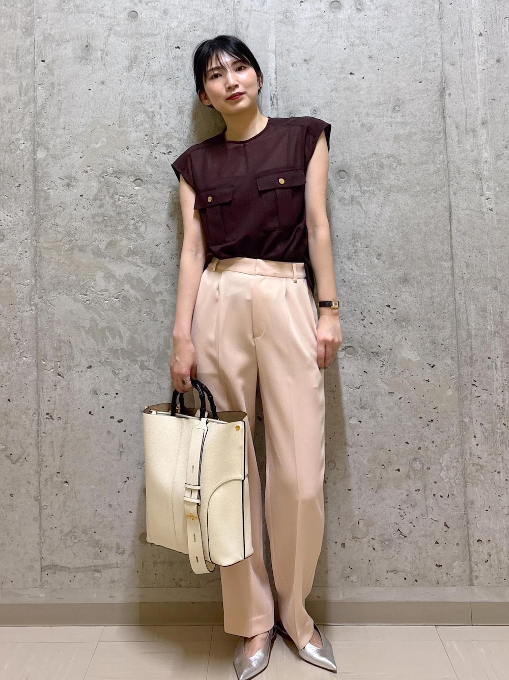 ほんのり透け感のあるブラウンのノースリーブブラウスに、 やわらかいピンクのスラックスを合わせて、上品さと軽やかさを両立。 かっちりした白のバンブーハンドルバッグで清潔感をプラスし、足元はメタリックなシューズでほんの少しのエッジを。 オフィスにも、品よくまとめたいお食事のシーンにもぴったりな、大人のきれいめコーデです。