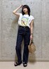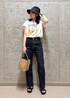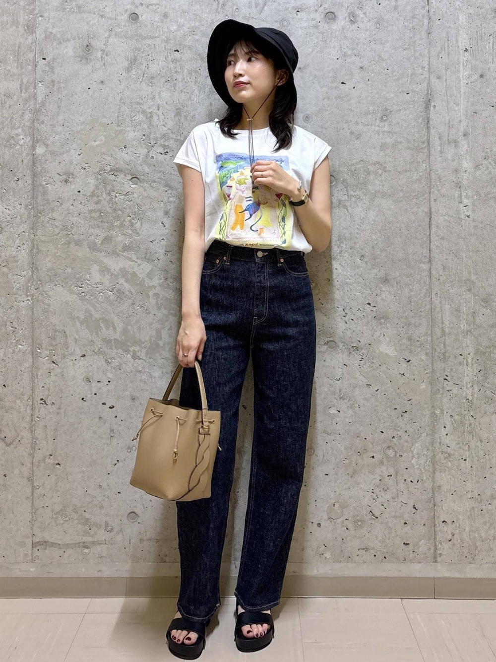 シンプルなデニムコーデに華やかさを与えるイラストTシャツ。 永山恵さん描き下ろしの、 ロペの夏のテーマ「ROMANTIC SAFARI」が 柔らかで色彩豊かな雰囲気で表現されています。 デニムはインディゴカラーで カジュアルに振りすぎず大人っぽい着こなしに。 バケットハットで日差し対策もバッチリ♪
