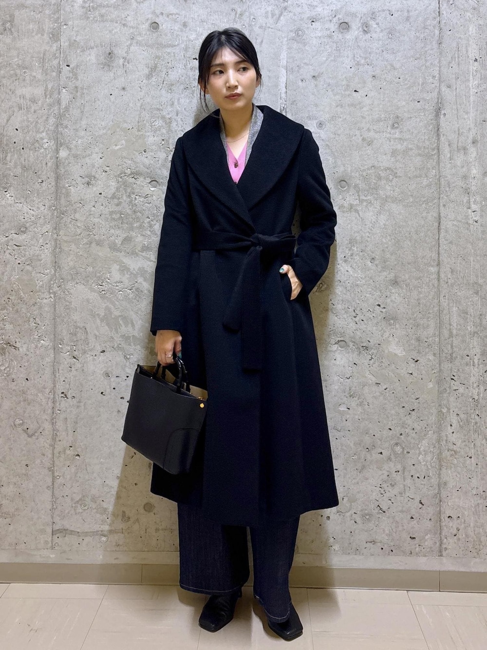 ショールカラーのロングコートは、程よいゆとりがあり ジャケットの上から羽織っても美シルエット。 ベーシックなブラックのコートも 差し色のピンクで気分を上げて。 通勤にもお出かけにも頼れる万能アウターです!