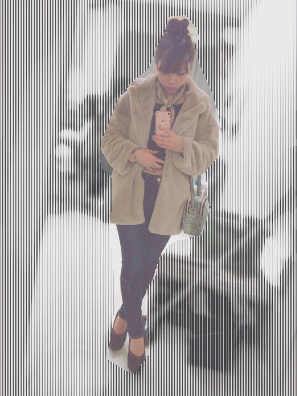 最近スカーフにはまってて いろんなとこに巻いてる〜 黒コーデばっかりだから たまには違うのも着たいなあ😘