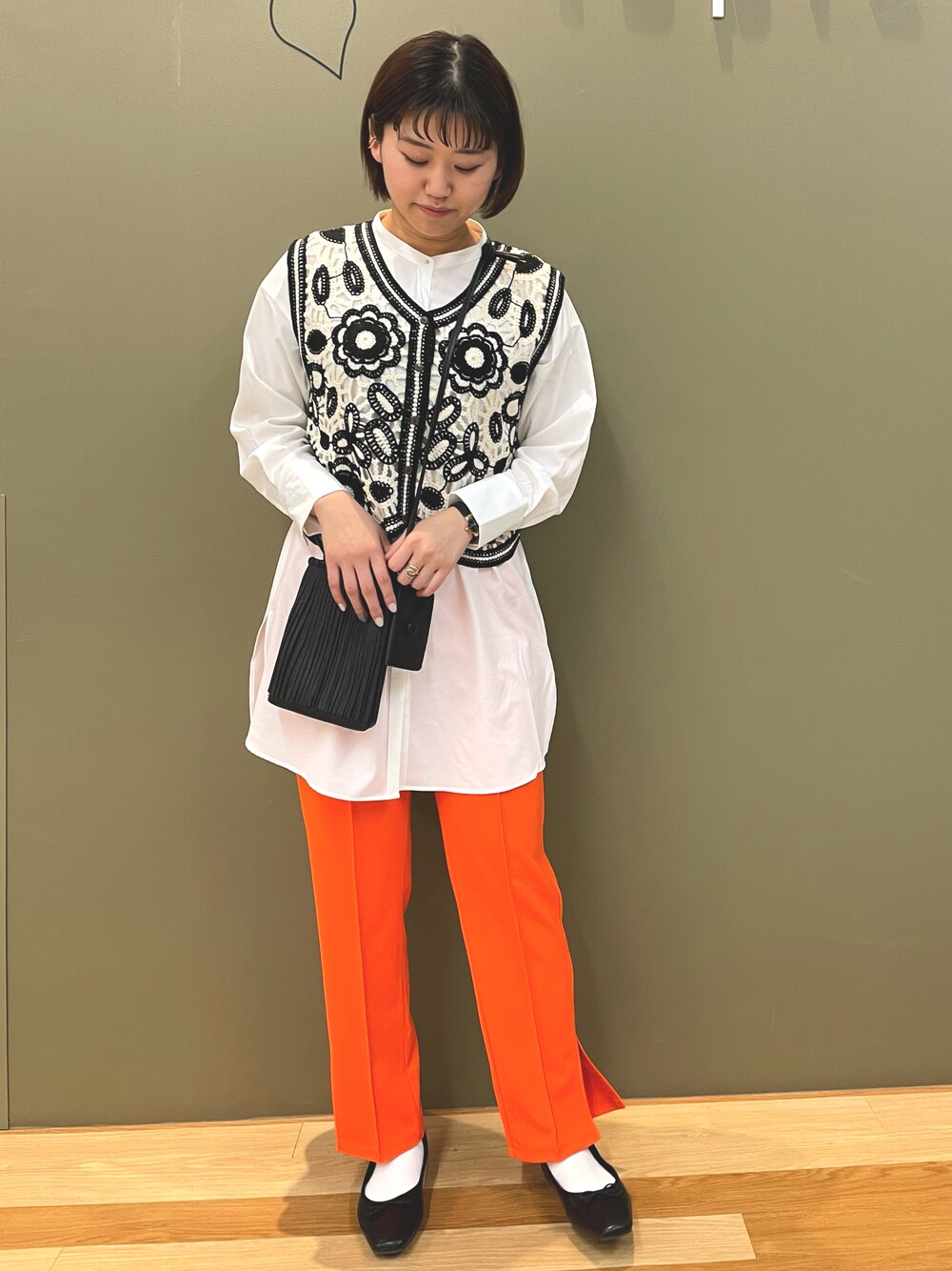 ビタミンカラーのカラーパンツと 夏まで使える軽めの生地のベスト 小物は黒でまとめると甘すぎない印象になります! 【サイズ】 シャツ F ベスト F パンツ F
