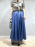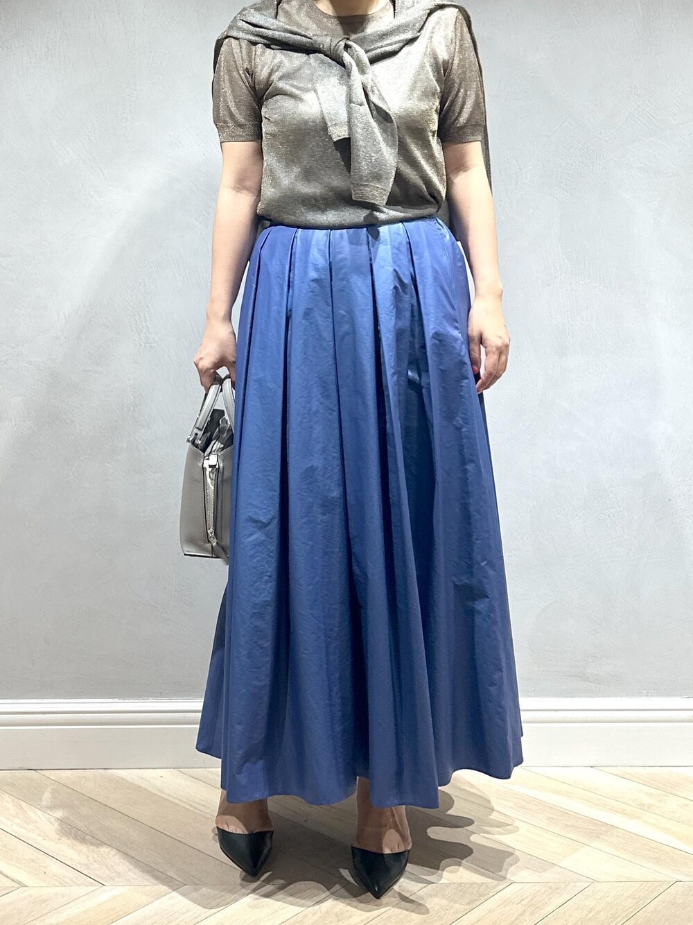 ラメのトップスにタイプライターのスカートを合わせ、大人きれいめなコーディネートにしてみました。 きちんとシーンでも着れるスタイリングですが、薄手でサラッとした着心地で、スカートは後ろゴムで楽ちん♪ツヤもありブルーのカラーもきれいでポイントになります◎ コンパクトなトップスや、Tシャツなどでカジュアル合わせもかわいいです♪