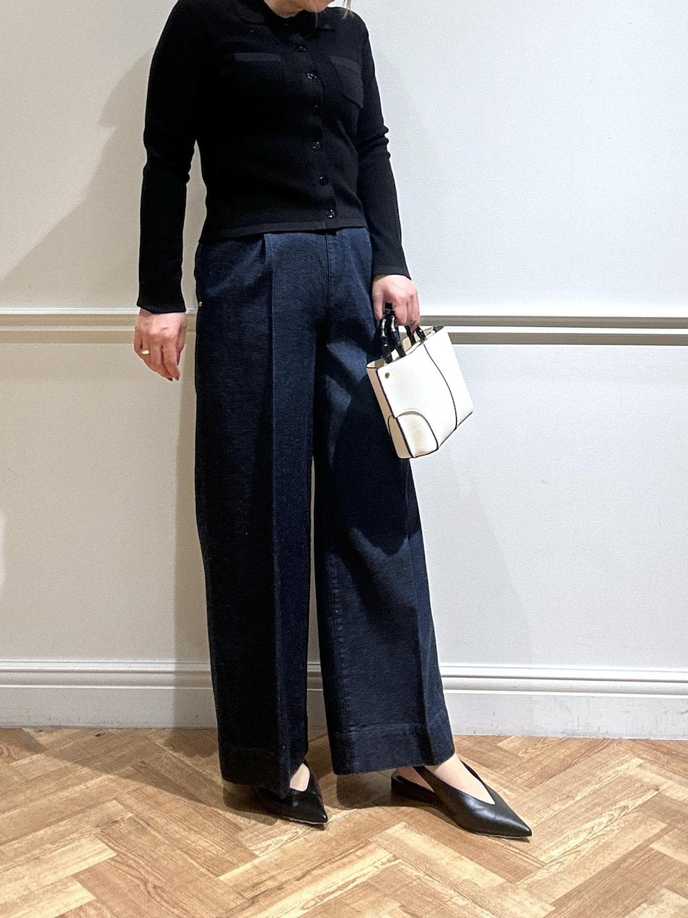 黒のポロニットにデニムで合わせてみました。 ポロニットは程よくゆとりがあり、柔らかくて着心地がいいです◎ ボトムもパンツやスカートで雰囲気を変えられるのでカジュアルきれいめ両方お使いいただけるのでおすすめです♪ 手洗い可能です◎