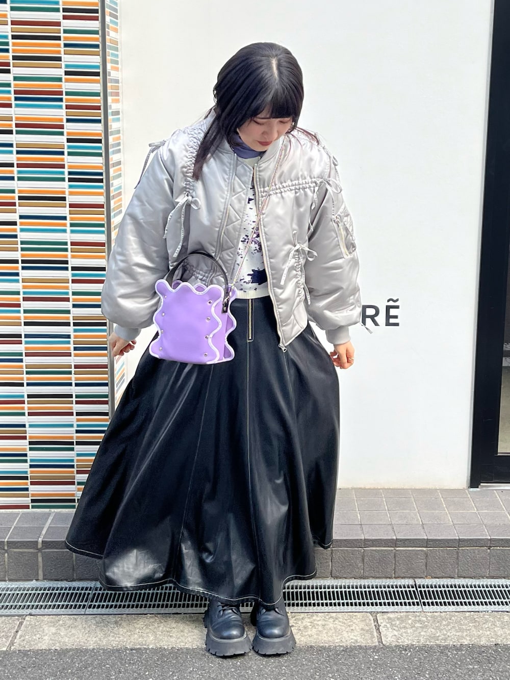 2025.2 冬物セールでGETしたアイテムたち! 冬物いつまで使えるだろう?笑 ときめいたシルバーのリボン盛り盛りアウター🎀 ニットの紫を拾ってインナーとバッグに! この冬はショート丈のニットとかカーデにハマってたな〜