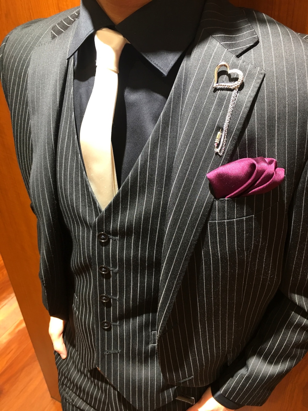 インナーコーディネート💡 ブラックのスリーピースにはブラックのシャツ、サテンホワイトのナロータイでドレッシーに✨ 挿し色でワインも良いですよね🍷