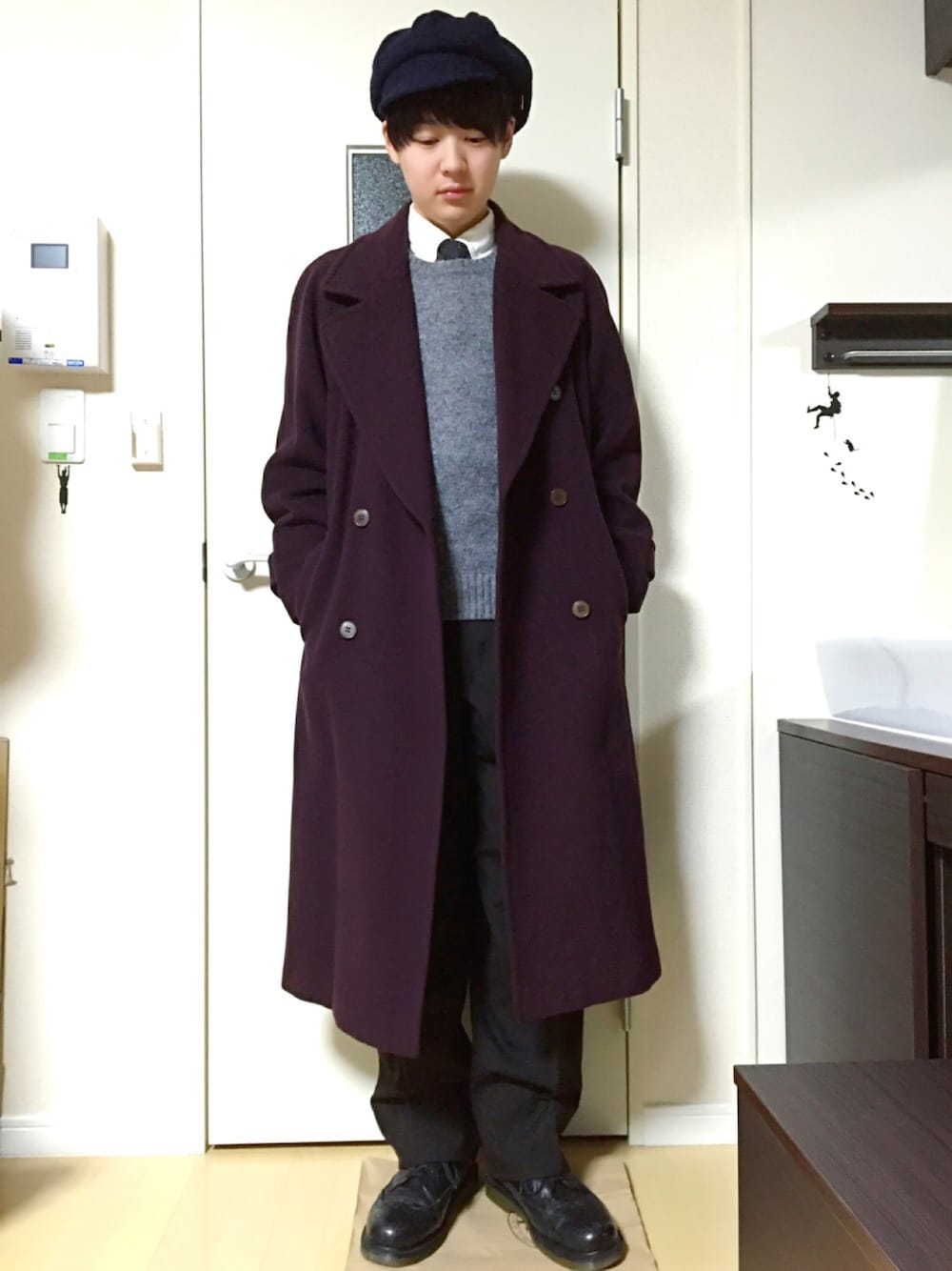 おはようございます。 いつもありがとうございます。 卒業試験の勉強をするためこんな時間に起床です。 今日はロングコートを使用しました。コートのワインレッドとパンツのブラウンを合わせるのがけっこう気に入ってます。