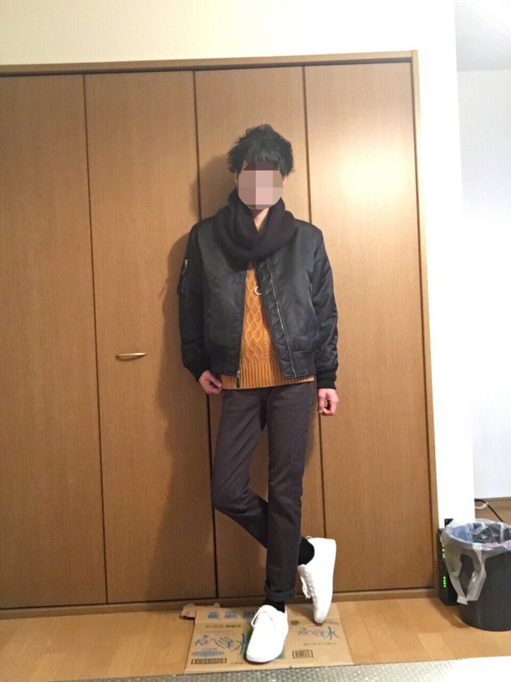 皆さんこんばんは。 GUの黒のMA-1ブルゾンとアベイルで黒のショートスヌード買ったので早速コーデしました。 パット考えて着てみましたけど、このコーデ今までの投稿したコーデでもなかなかかっこよくて好きなんですけど、どうでしょうか? 黒スヌードも黒MA-1ブルゾンも凄くかっこよくていいです! 近々ライダースジャケットのシングルとダブルが届きます。楽しみですヽ(*´∀`)ノ