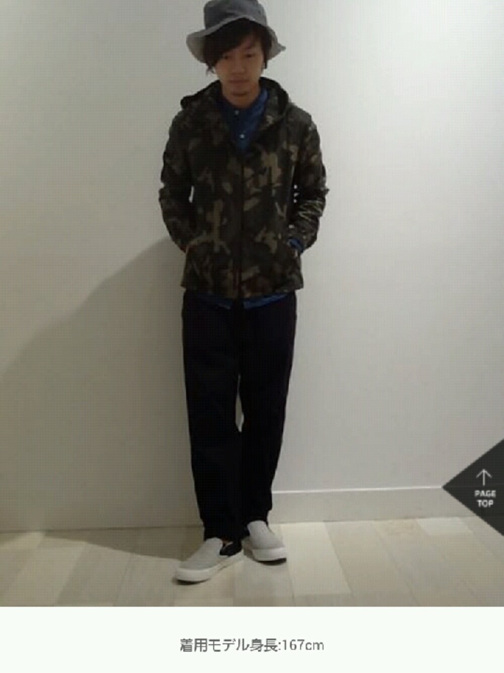 ワイドパンツには今季人気のバンドカラーのデニムをプラスしました。同色でまとめるとカモ柄も引き締めて取り入れられます!
