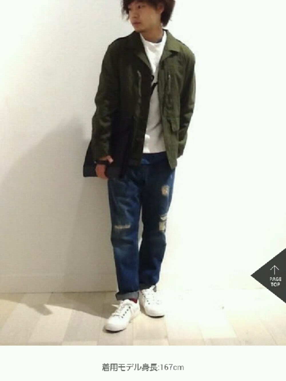 ミリタリージャケットはツイル素材で丈夫で扱いやすいです!ダメージデニムは加工verとパッチワークverがあります! 全体的にミリタリールックを意識してコーデを組んでみました。 靴下の赤はさりげなく☆