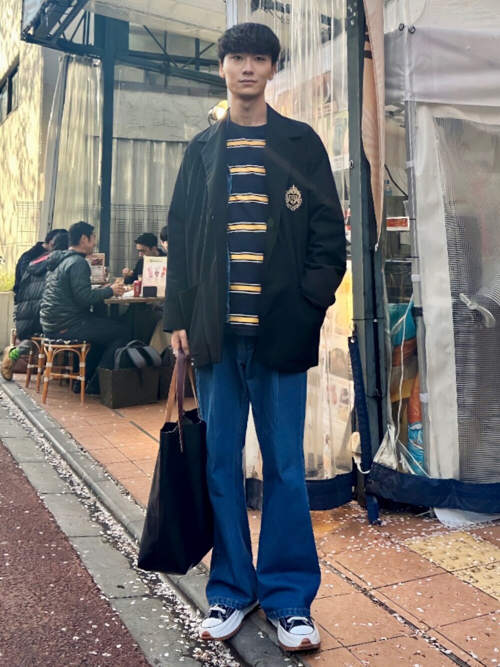 好印象!!キレイメカジュアルコーデ ビッグシルエットのシックなジャケットに春らしい大人カジュアルでも使えるボーダーTシャツでアクセントをつけました! トレンドライクなフレアデニムでスタイルアップするのがおすすめです♪ Instagram i.sxotxo