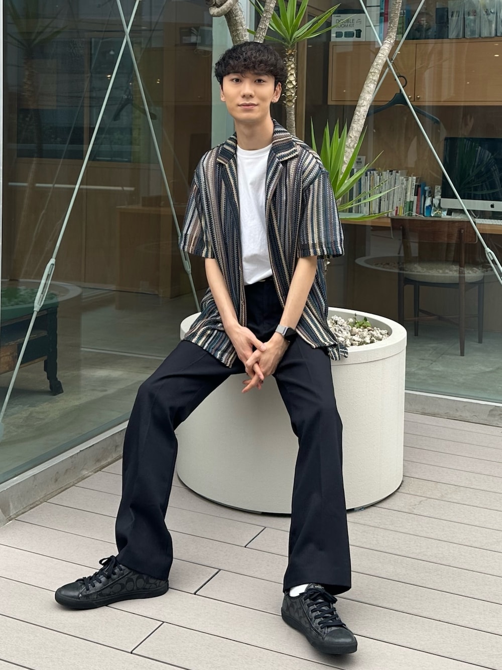 大人カジュアルコーデ🌻 モノトーンで大人っぽく組んでみました! シャツはレースになっていてトレンドライクなアイテムで持っていて間違いないです! 使いやすさもストライプ柄と透け感も程よいのでTシャツに合わせると尚◎です! パンツはフレアパンツで足長効果のある物をチョイス! トップスがインパクトのあるオーバーサイズのアイテムの為少し細めのパンツで 膝下が綺麗に見えると夏のシンプルなアイテムでも雰囲気が出るのでおすすめです🙆♂️ 是非参考にしてみて下さい🫡