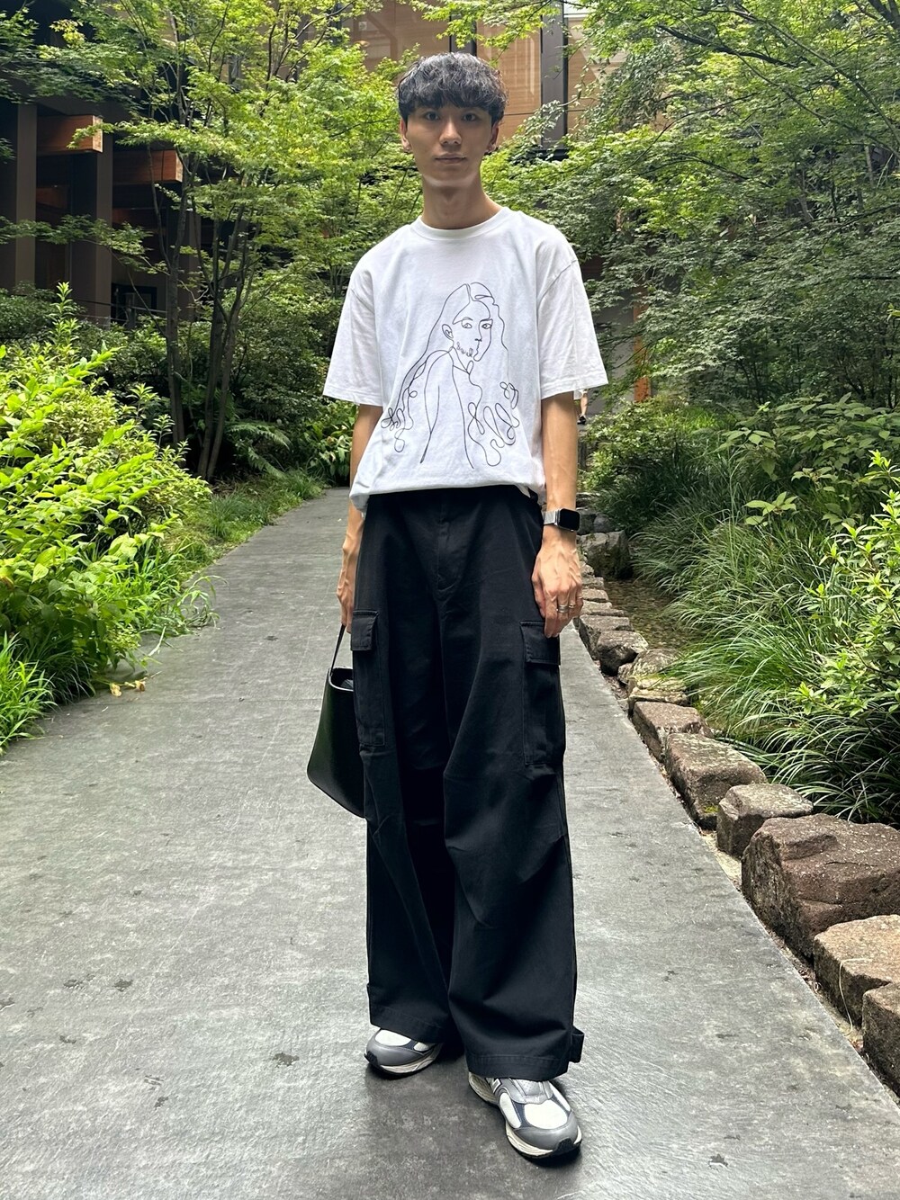 monotone style ワイドカーゴがかなり良い存在感があるので調子よくスタイリング出来ました😆 綺麗目な雰囲気を出すためにカジュアルすぎないプリントTで合わせました!! モノトーン・キレカジュ好きな方是非参考になると嬉しいです♪