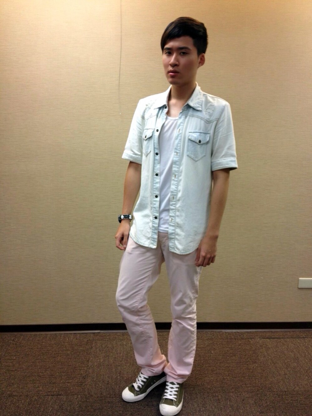 ピンク系のデニムパンツを着用したメンズの夏コーディネートの1枚目の写真