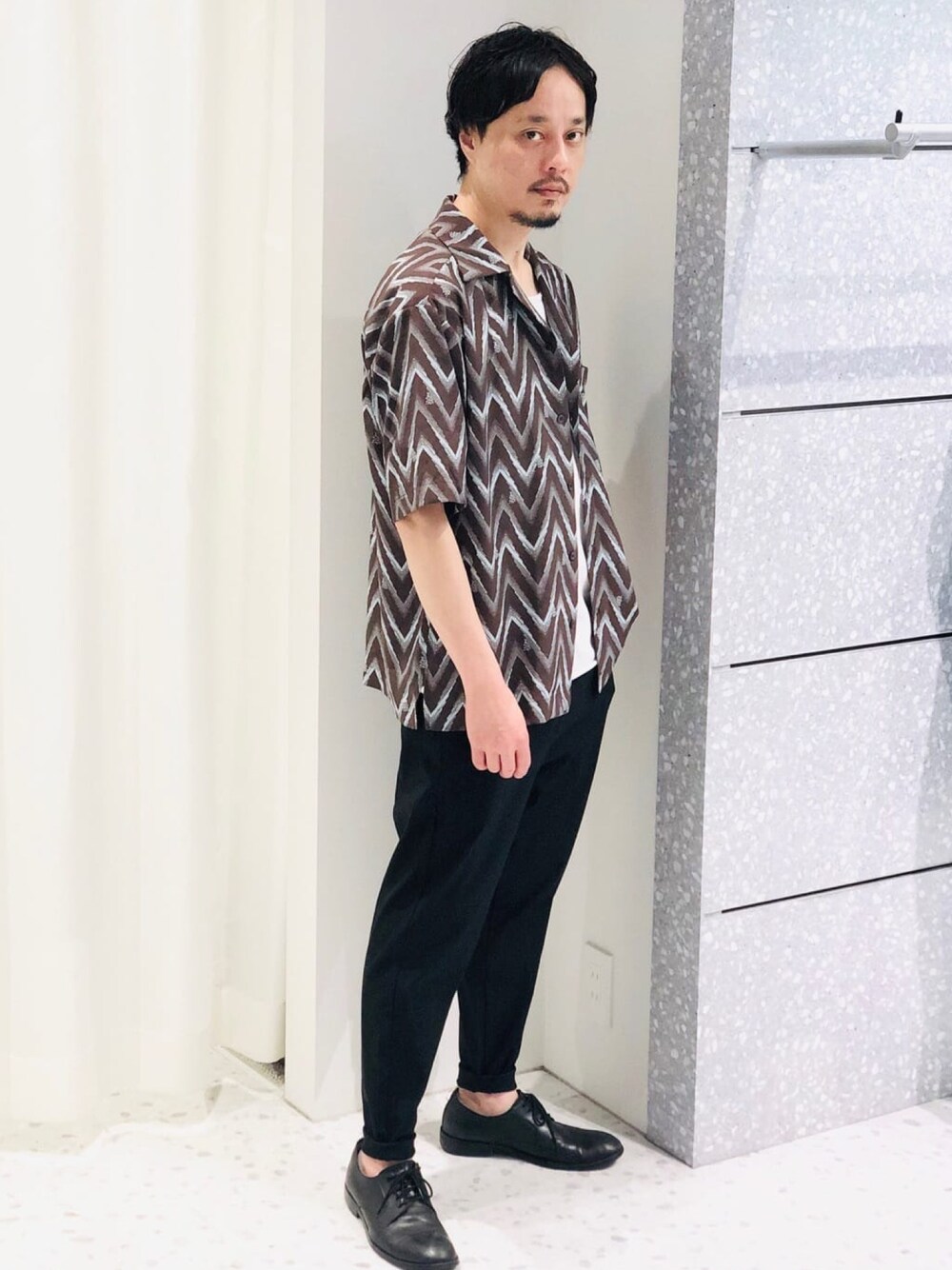 【168㎝/ JUST PLAY Rattle Trap キャナルシティOPA / 末次】 ヘリンボーン柄が特徴的で、目を引くデザインがいい感じですね! さらに肌触りがよく素肌で着ても着心地が良いの快適に過ごせますよ。 こちらのブラウンカラー渋い感じが落ち着いた印象になりかっこいいです。 ブラックのサルエルパンツとコーディネートしました。