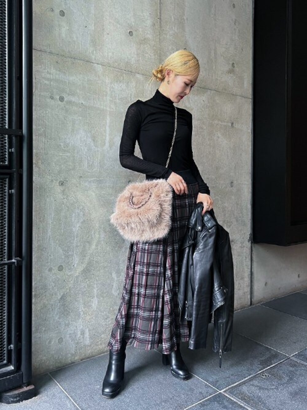 staff:kii 162㎝ 骨格ナチュラル チェック柄、ファーバッグ、レザージャケット、ショートブーツと秋アイテムを使ったコーディネイト。 ふわふわの手触りが心地良いファーバッグがテンションUPなコーデポイント★