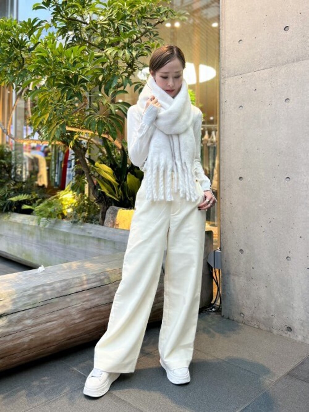 staff:kii 162㎝ 骨格ナチュラル ふわふわボリュームマフラーを使ったホワイトコーデ。 ボリュームたっぷりのマフラーは小顔効果も抜群。 日中は暖かくても、朝晩は寒くなってきたので、さっと取り出してつけられるマフラーがあるととっても便利。 秋コーデにプラスして、暖かコーデの完成★ テーマパークデートやドライブデートにもおすすめです。