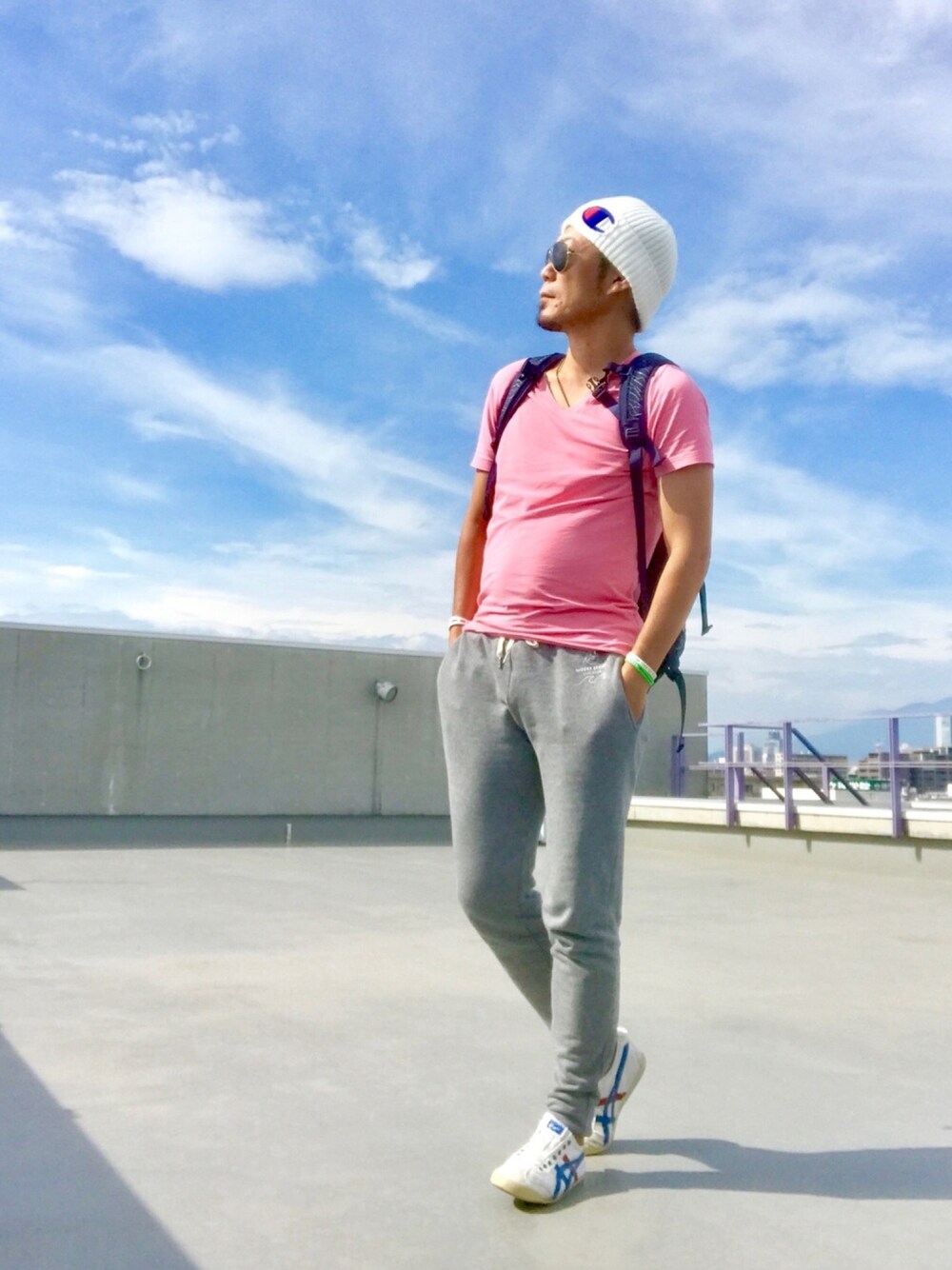 青空の下 爽やかピンクコーデ😆👍 ホワイト✖️ピンク✖️グレー✖️ホワイト Tシャツ✖️モエスポオルテガスウェットパンツ✖️スニーカー👟 のオルテガおじさん再び🤣 Instagram➡︎@crowd0614