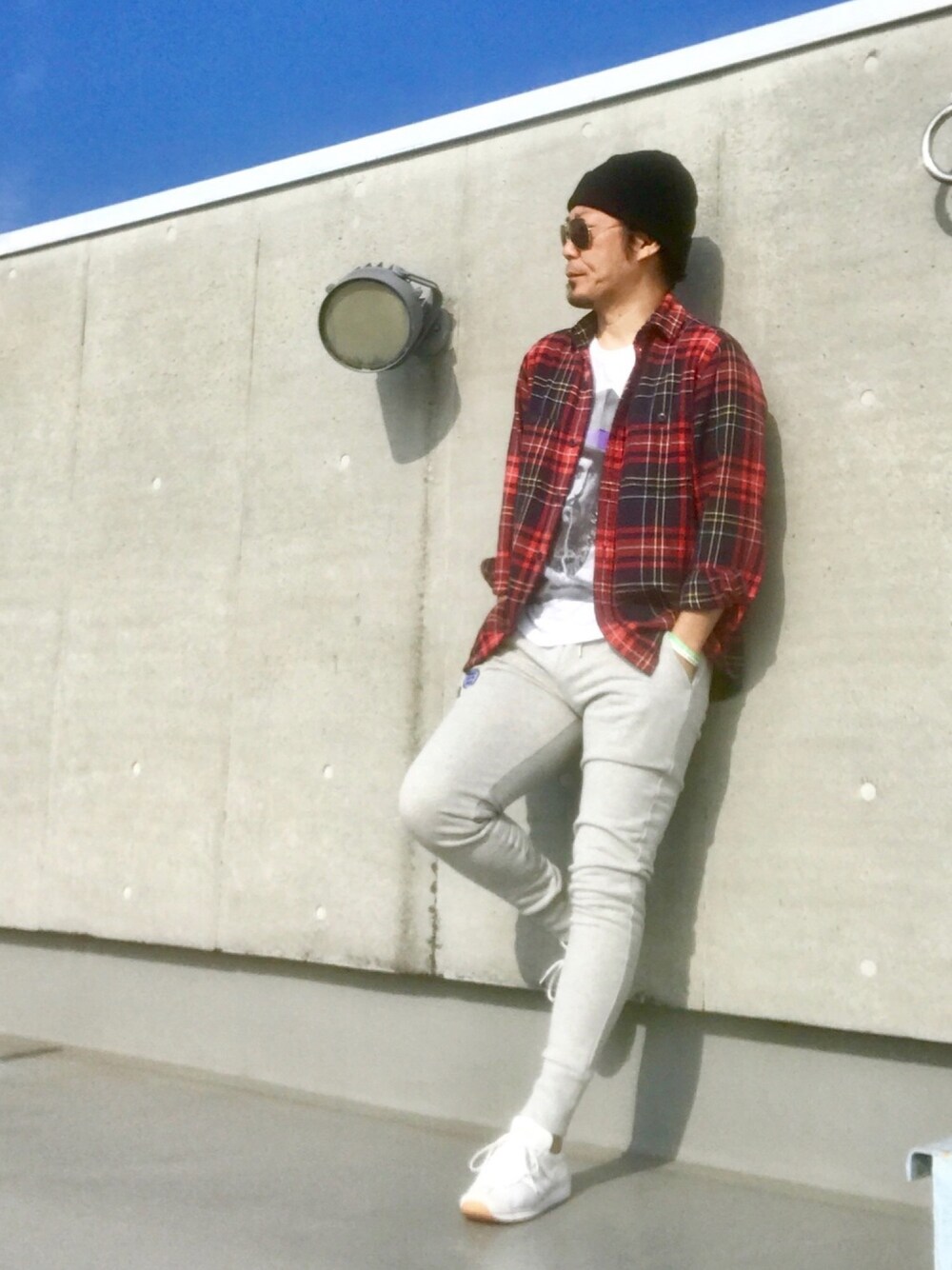 ☔️☔️☔️ チャイルドサッカー延期⚽️ 東名高架下の公園で 子どもとサッカー自主練😊😊😆 いつかのコーディネート 『赤チェックシャツ✖️ワッペンスウェットパンツ』 Instagram➡︎@crowd0614