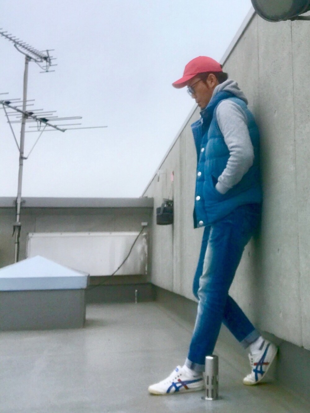 デニデニコーデ😆👍 中綿デニムベスト✖️クラッシュデニム 差し色に赤キャップ さらに、ポイントは 見えないけど、ボーダーソックスのトリコロール スニーカーもオニツカタイガーのトリコロール トリコロール好き🤣 Instagram➡︎@crowd0614