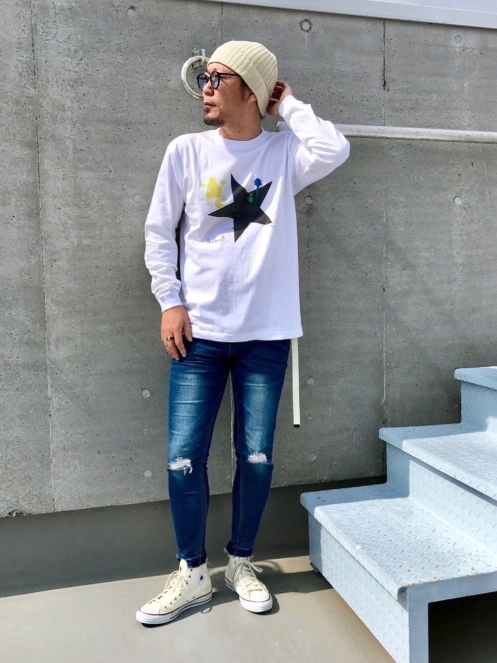 Number8 Spring Code カラーフェードニットキャップ ✖️ BIG STARロングスリーブTシャツ のシンプル春コーデ🌸 フロントのビッグスターにカラフルなペイントを装飾したデザインのTシャツが シンプルながら、インパクト大❗️❗️ Instagram➡︎@number8ec